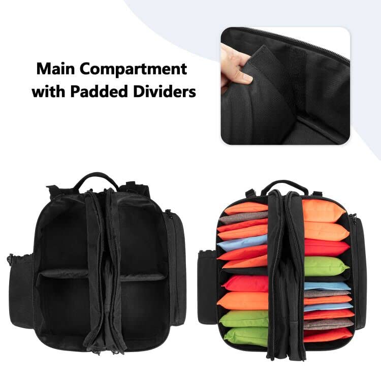 Holds 16 – 24 Cornhole Bags: Double compartments with padded dividers can hold 4 – 6 bag sets (16 – 24 bean bags); This design makes it easier get admission to to cornhole bean bags and keep your cornhole backpack organized well; (Patent Design)