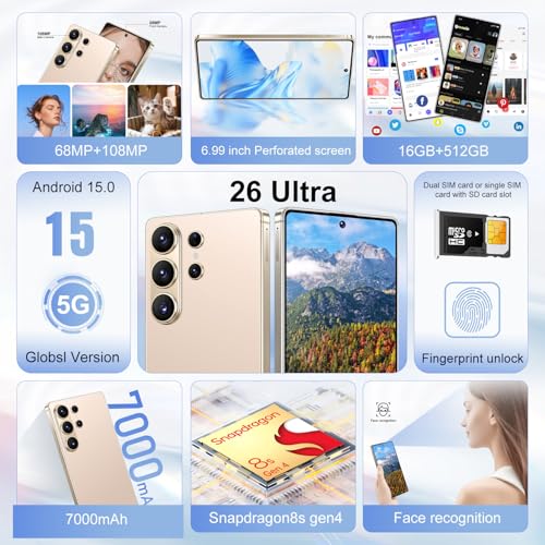 【6.99-inch HD Screen】I26 Ultra 6.99-inch HD large Screen with 3040*1440 resolution 5G cell phones,new feature Fingerprint Button Unlock-and take photos,deliver more vibrant colors and stronger contrasts. Magnesium aluminum body. better protect your privacy.
