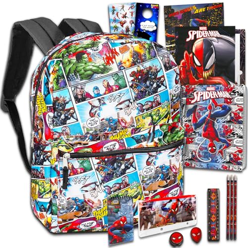 Marvel Avengers Backpack Set Boys Girls Kids — 7 Pc Bundle With Avengers Superhero School Bag, Folders, Pencils, Stickers and More (Marvel School Supplies). The deluxe Marvel Avengers backpack for girls and boys alike is produced from top of the range and durable materials. Features: large 16″ compartment for folders, notebooks, books and other school supplies; adjustable padded straps; large front compartment for pencils, pens and more; most sensible loop for hanging. Measures approximately 16″x12″x4.5″. Manufactured exclusively for Decade West. This 7 piece Marvel School supplies set includes: 1 Spiderman calculator, 2 Spicerman pencils, 1 eraser, 1 pencil sharpener, and 2 memo pads with Spiderman covers. This Marvel superhero backpack features artwork of iconic Marvel Avengers comic book legends including Iron Man, Captain The us, Hulk, Thor and more. This officially licensed Marvel superhero backpack set for children is easiest for back to college, go back and forth, birthday parties and more. Avengers backpack set also features a bonus superhero door hanger!