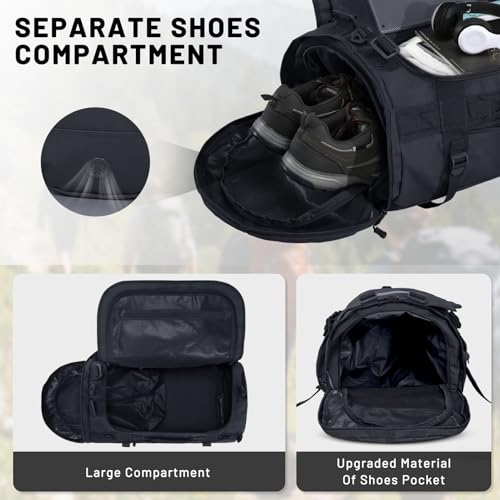 Multifunctional Pockets —- D-zip opening with a weather-resistant zipper flap included 1 big mesh pocket with 1 key loop inside, 1 inner zipper pocket and 1 open pocket; Out of doors: 1 zipper pocket on the front, 1 big side zipper compartment included a shoes compartment with mesh ventilated and 1 pocket for toiletries and towels; Water-resistant ID pocket on top