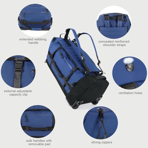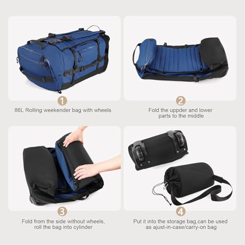 Rolling duffle bag,Regular size 29.5″L x 14.2″H x 12.6″W;Capacity 86 L.Weight 4.62 lb;Folded size 14.9″*9.5″