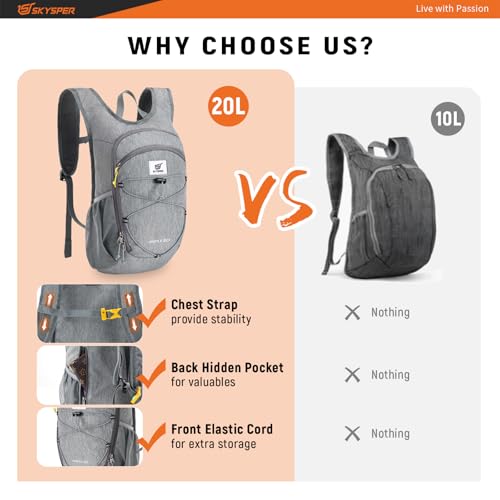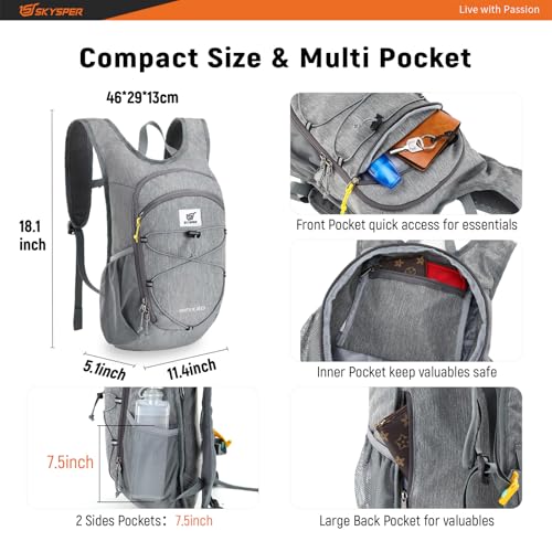 Spacious and Organized: Measuring 18.1 * 11.4 * 5.1 inch, this 20l hiking backpack features more than one compartments for easy packing and organization. The large main compartment with a wide opening makes it convenient to pack your trip essentials. Additionally, small hiking backpack includes 3 zippered pockets and a hidden back pocket. Two side mesh pockets (7.5 inch high) offer additional storage options for quite a lot of items