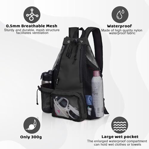 The Timoxi Swim Bag Beach Backpack is designed to improve your water sports and outside activities experience. Made with top-quality nylon waterproof fabric and tear-resistant mesh, this backpack is built to resist rugged use. Its waterproof and breathable construction ensures that your belongings stay dry and well-ventilated. The spacious interior features a large waterproof compartment that keeps wet clothes separate from dry items, maintaining cleanliness and convenience. With its drawstring closure, you’ll easily access your belongings, and the soft and thickened shoulder straps provide comfort all the way through extended use. This versatile backpack isn’t just suitable for swimming and diving but also perfect for fitness, yoga, hiking, and quite a lot of outside sports. It offers more than one pockets to meet different storage needs, including an independent water bottle compartment. The enlarged waterproof compartment provides ample space for storing swimsuits and other changing clothes. When not in use, the backpack Can also be conveniently folded into a compact size, making it easy to carry and store. With a weight of only 300 grams, it may not add unnecessary burden to your activities. Additionally, the backpack is machine washable, ensuring easy maintenance and cleanliness. Experience the convenience, durability, and functionality of the Timoxi Swim Bag Beach Backpack. Whether you’re heading to the pool, beach, gym, or embarking on outside adventures, this backpack is your reliable companion.