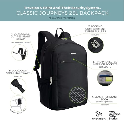 Travelon Classic Anti-Theft bags have been trusted by shuttle enthusiasts for years, and the Classic Anti-Theft Journeys 25 Liter Backpack is no exception. Designed to be both stylish and safe, it features Travelon’s patented 5-Point Anti-Theft Security System, allowing you to enjoy hands-free shuttle without worry—whether you’re navigating bustling markets or tackling adventure hikes. This backpack combines durability, safety, premium organization, and lightweight materials (weighing just 1.90 lbs) for a game-changing shuttle experience. Its slash-resistant body and straps, locking compartments, lock-down hardware, and RFID-blocking technology work together to safeguard your belongings and identity. With a breathable air-mesh back panel and shoulder straps, you’ll be able to stay comfortable all day. The spacious 25-liter main compartment includes a well-organized command center to keep all of your essentials within easy reach.