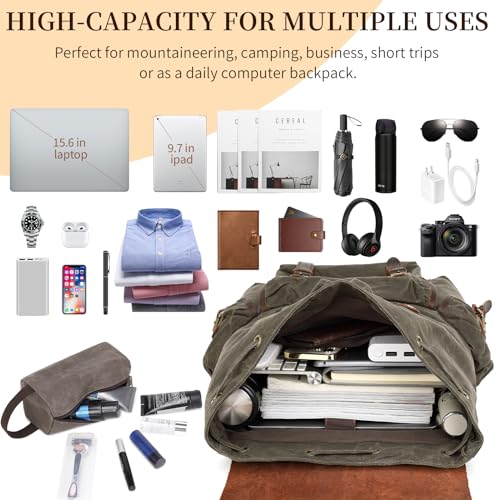 【Genuine Leather-Waxed Canvas Backpack】This backpack is made of waxed canvas with premium genuine Crazy Horse leather trim. High-density canvas is made of pure cotton, tightly woven and waxed, making it strong, abrasion-resistant, scratch-resistant and waterproof, effectively protecting your tech products. Crazy horse leather is made of top-end first-layer cowhide with a thickness of 2.5mm. Sturdy and durable, it can meet Day-to-day heavy-duty use and adventurers.