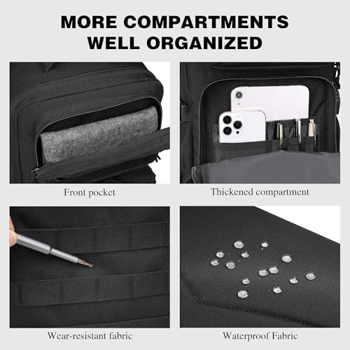 Premium Waterproof and Tear-Resistant Fabric: Crafted from durable 900D waterproof material, this tactical backpack offers superior protection against water and moisture, ensuring your belongings stay dry in unpredictable weather. The reinforced bottom with double-layer PU coating enhances its tear resistance and wear durability, making it the easiest companion for rugged outside adventures or demanding daily use