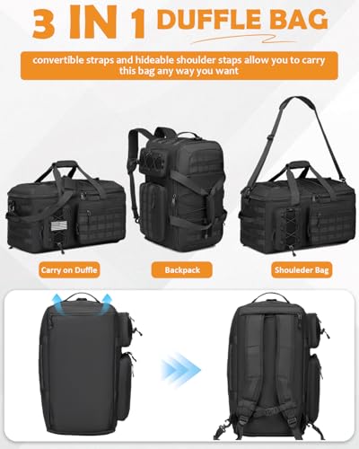 【Multi-Function】This versatile 3-in-1 tactical gym bag effortlessly converts between a carry-on duffle bag, a shoulder bag, and a backpack. It features a removable, adjustable shoulder strap for simple conversion to shoulder carry. Two additional backpack straps are conveniently concealed within the back compartment, taking into account instant transformation into a tactical backpack
