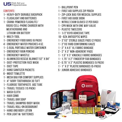 FIRST AID SUPPLIES: This emergency preparedness deluxe backpack comprises potentially lifesaving first aid and survival supplies, and is designed to beef up one person throughout a 3-day emergency situation or natural disaster. Kit comprises 177 essentials including drinking water pouch, hand crank powered flashlight/cell phone charger/radio, blanket, multi-tool, assorted bandages, cleanser, hygiene products, dust face mask, food bars, and more. 5 year shelf life for food and water.