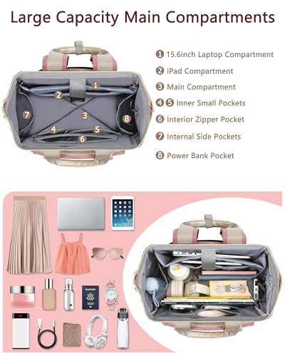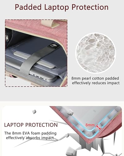 【MULTI-POCKET & LAPTOP PROTECTION】 The laptop backpack women has 3 compartments and 20 pockets. The main compartment area holds A4 folders,work documents,clothes and other daily necessities. Includes a padded laptop sleeve fits up to 15.6″ laptops and separate padded tablet slot for 12.9″ iPads. 2 side pockets specifically designed for water bottles, cups or umbrellas. Pink backpack providing a dedicated space for your pen textbooks wallet clothes shoes bottle and other shuttle essentials