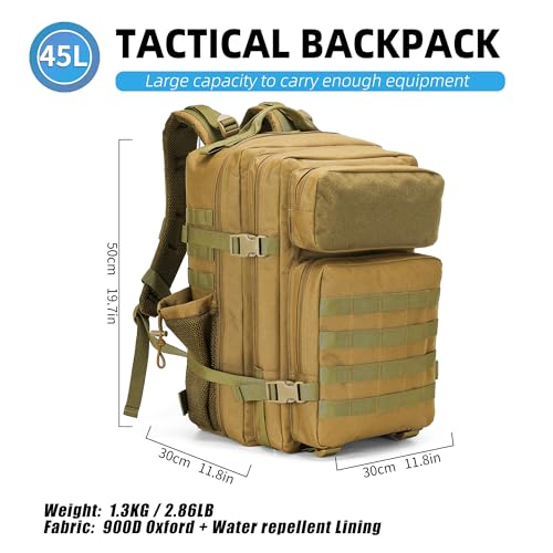 ✅ [Large Capacity Backpack]: The tactical backpack, measuring 19.7inch x 11.8inch x 11.8inch, has a capacity of 45 liters and can hold a 16-inch laptop at the side of clothing, out of doors blankets, food, and camping gear. Its spacious storage, durable materials, and versatile features cater to the needs of travelers, out of doors enthusiasts, and adventurers.