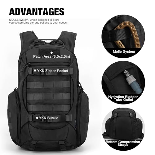 Consummate Design:Molle webbing all through this small tactical backpack for attaching additional tactical pouches or gear,The molle backpack also has bottom compression straps which can hang on your sleeping bag, tripod, or tent,The patch area on the top of this camping backpack can be utilized to paste your favorite patches