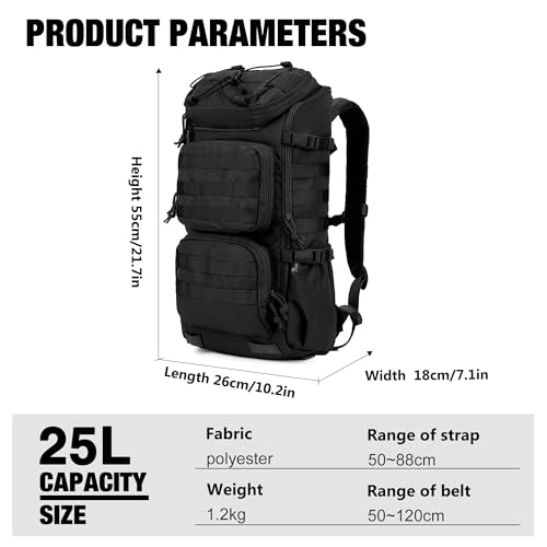 Durable Backpack:This molle backpack is 25 Liters and is made of 600D Polyester,YKK buckle and zipper,SIZE:10.2*7.1*21.7 in(L*W*H) ,1.2KG