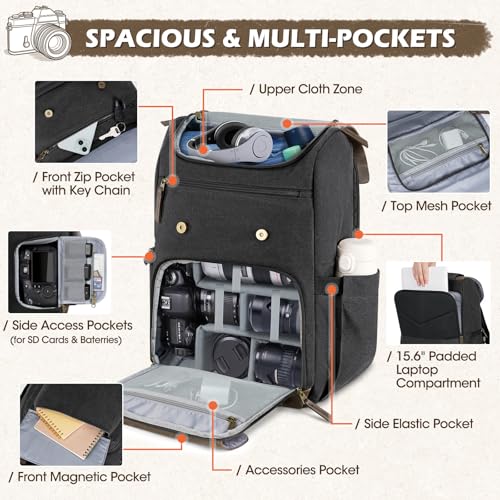 ALL DAY COMFORTABLE & USER-FRIENDLY – Designed for photographers, this backpack offers ergonomic comfort and durable utility. Despite weighing 1.55kg, it features a breathable back padding, wide shoulder straps, and an adjustable chest buckle to provide balanced weight distribution and beef up. It remains comfortable even when fully loaded. A luggage strap allows easy attachment to suitcases for hands-free. With its practical vintage style, it’s also the perfect gift for any photographer.