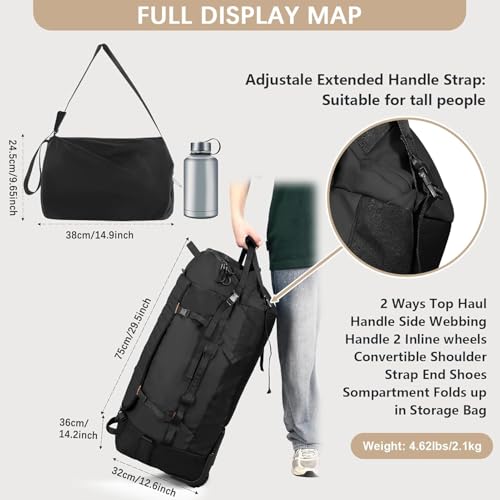 Rolling duffle bag,Regular size 29.5″L x 14.2″H x 12.6″W;Capacity 86 L.Weight 4.62 lb;Folded size 14.9″*9.5″