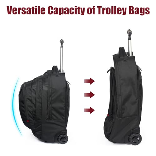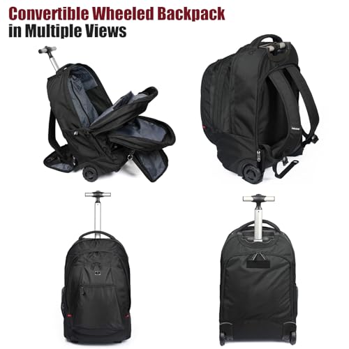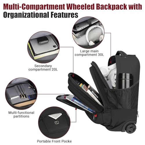 SPACIOUS & ORGANIZED: Dive into a world of convenience with our structured backpack with wheels. The generous main compartment, tailored for a 21″x14″x9″ capacity, presents a protected, padded laptop sleeve for devices up to 17 inches, aligning with the needs of modern business trip. Beyond the basics, it offers a slender pocket for magazines, an accessible quick pocket for passports, an elaborate front organizer with a key hook, and side mesh pockets for hydration — a in point of fact organized rolling backpack.